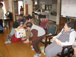 出勤職員全員がくじ引きをし、鬼を決めました。鬼が段ボール箱を背負い、新聞紙を丸めてボール状にした玉を利用者様がその段ボール箱に投げ入れる。多く入れた方が勝ちというゲームです。