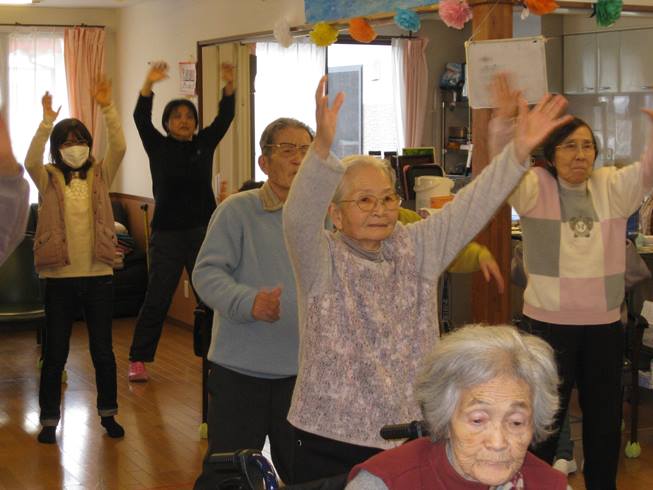 利用者の方々から「いつ“よさこい”を踊るんな?」「どこでするんか。応援いかんといけまあ。」と言われ、昼食会の後に当法人新年会で2位を受賞した“よさこい”を再現しました。先に職員が踊りその後、利用者様ご家族様と輪になって踊りました。