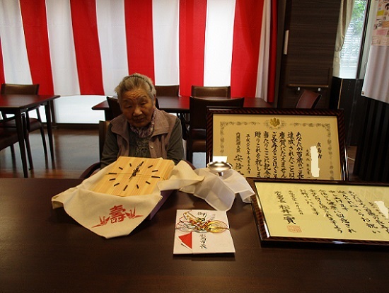 今年9月、サービス付き高齢者住宅「すまいる川内」へ入居されているN様が、めでたく100歳を迎えられました。100歳を記念し、広島市安佐南区の職員の方が施設に来られ、内閣総理大臣や広島市長の名前の入った「お祝い状」2枚と「銀杯」をN様に贈られました。